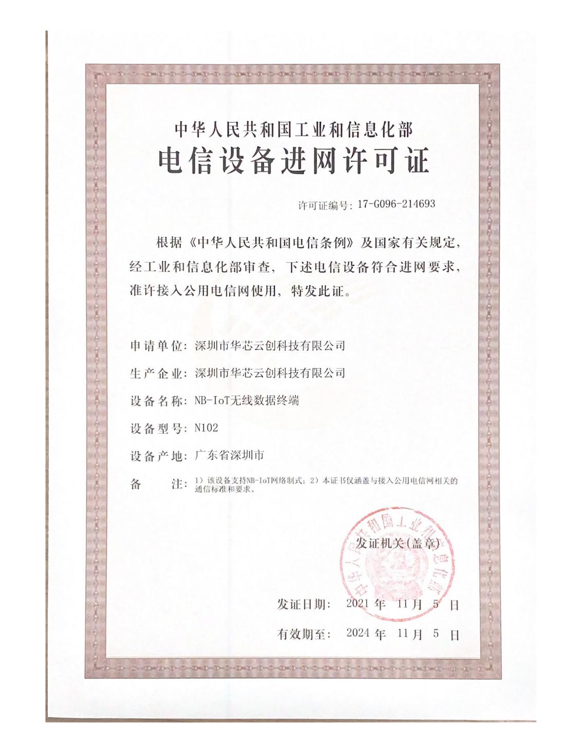 华芯NB-IoT无线数据终端通过国家电信设备进网许可